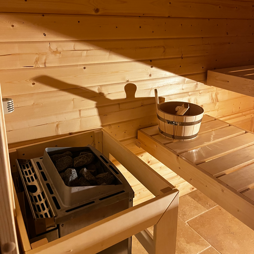 Profitez d'un spa de nage de 4,5 mètres de long, équipé de quatre places massantes, ainsi que d'un sauna finlandais pour une relaxation totale.